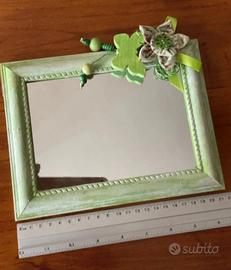 Specchio con cornice in legno a effetto shabby chic e decorazione laterale, di colore verde.