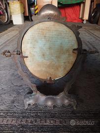 Bellissimo specchio vintage da tavolo, con cornice in metallo lavorato e dettagli decorativi eleganti. Lo specchio presenta una patina del tempo che gli dona un autentico fascino retrò. Base stabile, struttura solida, ideale come pezzo d’arredo, per toeletta, camera da letto o angolo beauty. Perfetto per chi ama lo stile antico o cerca un oggetto decorativo unico.