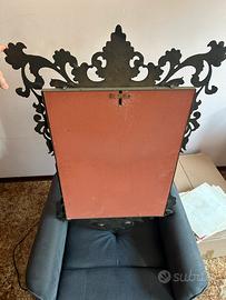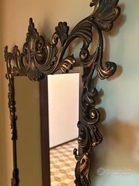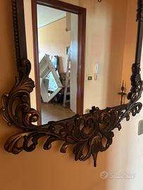 Specchio da parete in stile barocco/rococò con struttura in metallo lavorato finitura ottone. Elemento molto decorativo e di grande impatto estetico, ideale per ingresso, soggiorno o camera. 📏 Dimensioni: 100 x 62 cm ⚖️ Specchio robusto e pesante (circa 10 kg), indice di buona qualità costruttiva. Cornice ricca di dettagli e lavorazioni, con belle finiture in stile classico/vintage. Buone condizioni generali. Si consiglia fissaggio a muro con tasselli adeguati vista la struttura solida. Ritiro a mano. Disponibile anche console coordinata (vedi altri annunci).