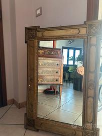 Elegante specchio con cornice decorata in stile classico, riccamente intagliata con motivi floreali e geometrici. La struttura è solida e rifinita in toni dorati antichizzati, ideale per ambienti dallo stile classico, barocco o eclettico. Misure