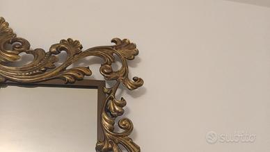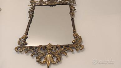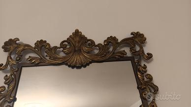 Elegante specchio vintage di forma rettangolare con elegante e raffinata decorazione tutta in metallo color oro/bronzo.