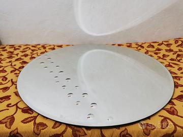 Lo specchio rotondo ha un diametro di 78 cm, un motivo decorativo di cerchi "specchio su specchio" (non sono in rilievo) e una cornice leggermente smussata. È applicato su una base di legno con due fori per l'applicazione al muro. Peso circa 10 kg