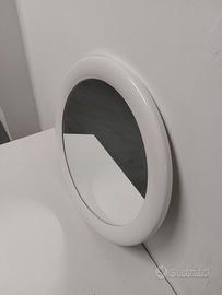 Specchio vintage rotondo anni 70, in ottime condizioni senza segni di usura, colore bianco in materiale pvc resistente, in stile Space Age dell’epoca, ottimo per arredo di bagni semplici in stile retrò. Misure: Diametro specchio 55,5 Cornice bianca 5,5cm Profondità 2cm. Zona Piazza Irnerio, Roma. Mauro.