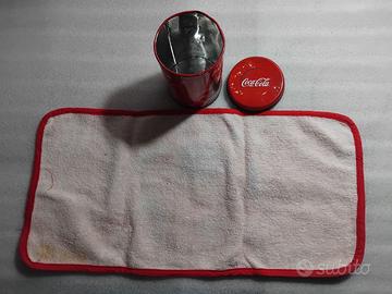 "SPEDIZIONE TRACCIABILE INCLUSA" : (Prodotto originale) Oggetti da collezione COCA COLA vintage; TOVAGLIETTA da bar in spugna, dimensioni 46 cm x 24 cm, e SCATOLA in latta cilindrica, dimensioni 12 cm x diametro 8 cm. _Fabio - 3334231359 - anche WhatsApp. e mail.