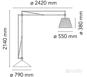 Lampada da terra a luce diretta e diffusa. Diffusore interno in vetro borosilicato soffiato a bocca con finitura acidata. Diffusore esterno in tessuto plissettato. Supporto diffusori in alluminio fuso in terra. Assieme struttura, verniciata a liquido di colore grigio, composto da bracci e tiranti in tubolari di alluminio, molle in acciaio inossidabile e giunti in lega di alluminio pressofuso. Base in alluminio fuso in terra, n° 6 contrappesi di piombo e copertura base in alluminio tornito in lastra verniciata a liquido di colore grigio. Sul cavo è presente il dimmer elettronico che consente la regolazione a step dell'intensità luminosa.