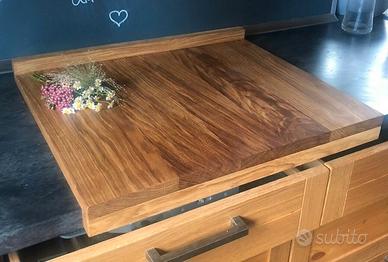 Il piano di cottura/piano di lavoro in legno massiccio è particolarmente robusto e resistente. Con il bordo di arresto non è più possibile scivolare sul piano di lavoro. Il piano di lavoro può essere utilizzato su entrambi i lati e può essere utilizzato come tagliere da forno, tagliere per pasta, tagliere per pasta o tagliere per pizza. I bordi di arresto possono essere facilmente spinti fuori, rendendo la tavola facile da riporre. L'altezza di battuta dei listelli è di 3 – 3,5 cm, in modo che il cassetto sottostante possa ancora essere aperto.