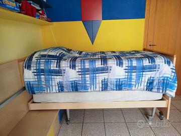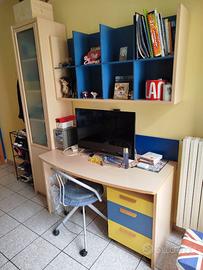Vendesi bellissima cameretta con due letti scorrevoli, triplo armadio, scrivania, sedia, pannelli in legno colorati che salvaguardano le pareti, cassetti porta tutto, viene utilizzato ogni piccolo spazio