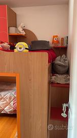 o Area Studio Angolare: Una scrivania spaziosissima ad angolo, ideale per studiare o usare il PC. Include una cassettiera rossa su ruote, una sedia ergonomica arancione e una fantastica libreria a pensile per organizzare libri e quaderni.