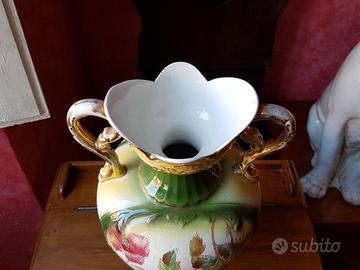 Splendida coppia di vasi inglesi primi anni del 900 dai colori estremamente vividi, alcune mancanze nella rifinitura superiore in oro zecchino dovute al tempo. Dai timbri sottostanti sono vasi Barkers & Kent di Fenton. Quel tipo di timbro fu usato dal 1898 al 1941. Altezza molto imponente di 41 centimetri. Per l'eventuale spedizione occorrerà accordarsi su imballo e costi.