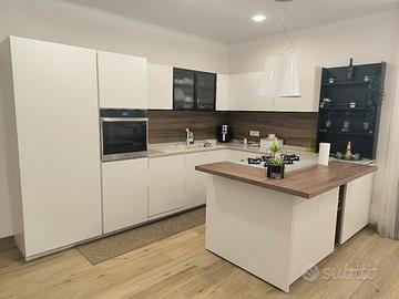 Cucina MAISTRI, laccata,con piano di lavoro in OKITE. Boiserie in legno massello, dotata di chiusura ammortizzata. frigo da 65 LT. completa di tutti gli elettrodomestici.