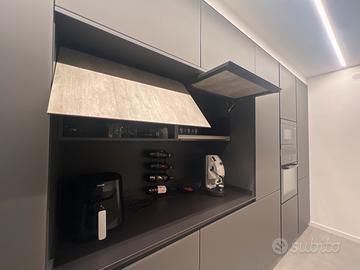 Il piano ed i fianchetti sono rivestiti in Dekton, materiale che troviamo anche nella nicchia tra le colonne ed i pensili.