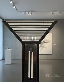 Splendida lampada da terra originale degli anni '80/'90, un pezzo iconico di illuminazione vintage italiana. Il design si distingue per l'eleganza dei materiali e le linee geometriche tipiche del modernismo di fine secolo.