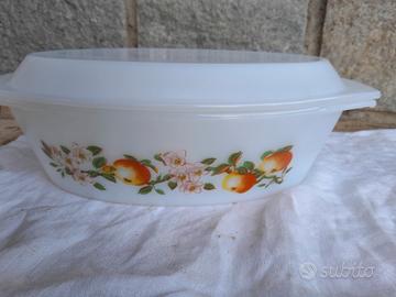 Splendida pirofila originale Arcopal in vetro opalino bianco satinato con delicato decoro mele e fiori.