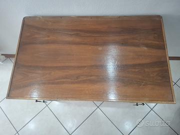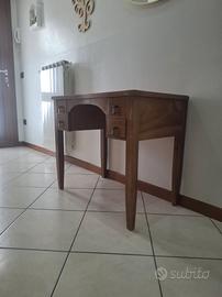 Vendesi elegante e affascinante toeletta (mobile da trucco) d'epoca in legno massello. Un pezzo unico che aggiunge un tocco vintage e romantico a qualsiasi camera da letto. Il mobile è caratterizzato da: Stile: Linee classiche e intramontabili, perfette per ambienti vintage, shabby chic o rustico-eleganti. Praticità: Ben 4 cassetti laterali (due per lato) perfetti per organizzare trucchi, gioielli, profumi o accessori. I pomelli originali in metallo sono finemente lavorati. Materiale: Solido legno massello con venature calde e naturali. Design: Bellissima arcata centrale sottopiano e gambe a sciabola eleganti e slanciate. Il piano è molto spazioso. Dettagli: specchio non incluso nella vendita. Condizioni: Struttura molto robusta e ben conservata. Presenta lievi e normali segni del tempo sul piano che non ne compromettono l'estetica, ma ne aumentano il carattere.