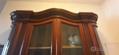 Splendida vetrina in legno intarsiato, ben rifinita e rivestita negli interni ben conservati, con 2 vetrine davanti, due altre vetrine angolari curve ai lati, due cassettini, due sportelli e altri due sportelli angolari nella parte inferiore. possibile usarla in sala da pranzo o nell'ingresso. ha un valore alto di mercato, svendo causa trasloco. misure: altezza 2,23 lunghezza 1,84 profondità 50.
