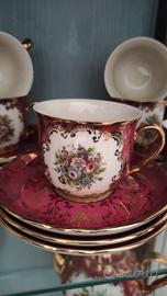 Delizioso set da tè in porcellana decorata con motivo floreale su sfondo bordeaux e ricchi dettagli dorati. Un classico della linea "Marie-Luise" di Seltmann Weiden. Il set è completo, a eccezione di una tazza rotta.