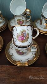 Servizio da caffè in pregiata porcellana bavarese decorata a mano, composto da 12 tazzine con piattini abbinati, zuccheriera, lattiera e caffettiera. Eleganti decorazioni floreali e dettagli in oro zecchino. Perfetto per collezionisti o per arricchire la tavola con stile classico.
