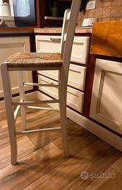 Vendo 2 splendidi sgabelli alti con schienale, ideale per penisole in cucina, banconi bar o taverne. L'articolo è realizzato in solido legno con finitura bianca leggermente decapé (stile shabby chic) che ne esalta le venature e l'aspetto artigianale.