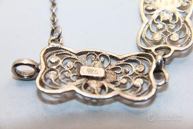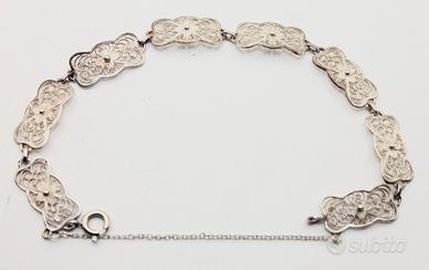 Questo è uno splendido bracciale antico realizzato in filigrana d'argento. La delicata lavorazione in filigrana crea un motivo elegante e leggero, tipico dei gioielli d'epoca. Il bracciale è dotato di una pratica catenella di sicurezza, un dettaglio che testimonia la cura e l'attenzione per la qualità artigianale del tempo. Con una lunghezza di 18 cm e un'altezza di 10 mm, si presenta come un accessorio raffinato e non invadente. Questo gioiello rappresenta un affascinante pezzo di storia della gioielleria, perfetto per chi apprezza l'eleganza senza tempo.