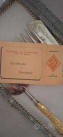 Splendido ed Esclusivo Set Servizio Dolce A. Bettini – Lusso Artigianale Italiano Descrizione dell'Oggetto: In vendita un magnifico set da portata per dolci e torte, un autentico capolavoro dell'artigianalità italiana firmato dalla storica e prestigiosa manifattura A. Bettini. Questo set da 3 pezzi (comprendente un coltello da torta, una forchetta da portata e una paletta per dolci) non è solo un utensile da cucina, ma un pezzo d'arte decorativa che trasuda eleganza e raffinatezza. Ogni pezzo è frutto di una lavorazione meticolosa, caratterizzato da un design classico e intramontabile con delicati e complessi motivi floreali incisi a mano sulle impugnature, che catturano la luce e incantano lo sguardo. Dettagli Tecnici e Materiali (Per la massima trasparenza): Finitura Preziosa: Le impugnature presentano una lussuosa e spessa placcatura in Oro 24 Karati, che conferisce una lucentezza calda e inconfondibile. Rivestimento in Argento 800: Come attestato dal punzone originale "800" visibile sul collo di ogni pezzo e confermato dal certificato di garanzia incluso, il set è rifinito con una pregiata placcatura in Argento 800 (silver-plated) di altissima qualità, applicata su una solida base di metallo. Nota bene: Si tratta di oggetti placcati (silver-plated) e non in argento massiccio. Questa tecnica garantisce la bellezza dell'argento unita alla resistenza e alla durevolezza necessarie per l'uso quotidiano. Stato di Conservazione: Il set è in condizioni eccellenti, praticamente pari al nuovo, mai utilizzato e conservato con cura estrema. Confezione e Documentazione: Viene venduto completo della sua scatola originale d'epoca, rivestita in un'elegante texture effetto pelle di serpente e foderata in morbido velluto e seta bianca, perfetta per la presentazione o come regalo di lusso. Include anche il certificato di garanzia originale A. Bettini, che ne attesta l'autenticità e la qualità dei materiali. Un Pezzo Unico per la Tua Tavola: È un investimento in bellezza