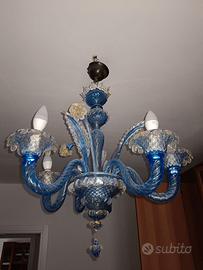Magnifico lampadario d'epoca in autentico vetro di Murano soffiato a mano, caratterizzato da un colore blu cobalto e Oro – 6 Luci – Artigianato Veneziano con eleganti dettagli in vetro trasparente e finiture che richiamano la lavorazione a foglia d'oro/ambra nei dettagli floreali.