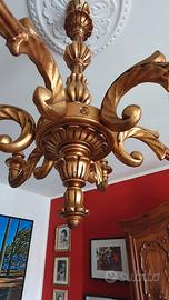 Lampadario in legno laccato oro zecchino, 6 fiamme, adatto sia ad un ambiente classico che moderno