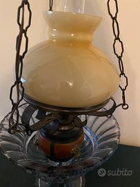 Lampadario vintage che riproduce le forma delle antiche lanterne a petrolio, doppio vetro, sospensione con catenelle e cono terminale in metallo, base in legno con decorazioni metalliche. Ottimo complemento per arredamenti classici.