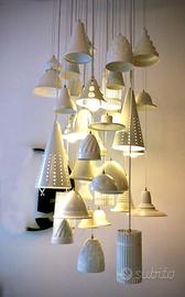Composto da diverse sospensioni, ognuna con altezza regolabile a piacere e con paralume di forma unica e ditterente dalle altre.
