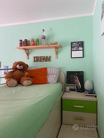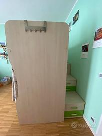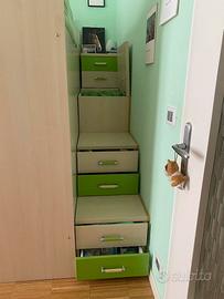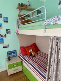 Vendo cameretta a castello con terzo letto estraibile compreso di due comodini e scala di salita laterale. Le scale sono dotate di quattro cassetti e di una porta salvaspazio. La camera è tenuta egregiamente e non presenta nessun difetto. La lunghezza dei materassi è 2 m per 80 Cm. Le reti sono con doghe di legno. Smontaggio e trasporto a carico di chi acquista.
