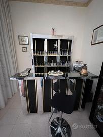 Mobile Bar in stile anni 80 con sedia alta e frigorifero (da revisionare vista l'età) in acciaio cromato e velluto nero. Munito di 2 comparti refrigerati e stipetto. Condizioni pari al nuovo. Prezzo trattabile.