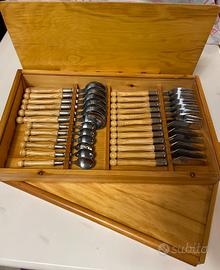 Due splendidi cofanetti in legno con posate nuove in stile rustico con manico di legno, nuove, MAI uscite dai cofanetti. Tot. 48 pz. suddivisi in due cofanetti con set da sei persone ognuno (forchetta, coltello, cucchiaio e cucchiaino).vendo tutti e due per € 70, se separati € 40 l’uno. Contattare prima tramite sms, grazie. Claudio