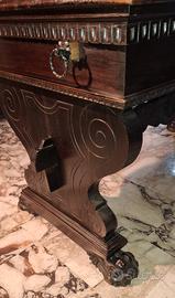 Vendo tavolo/scrivania in stile "Neo Rinascimento" italiano, di fabbricazione di inizio Novecento, in legno massiccio ebanizzato, con decorazioni scolpite a motivi floreali e geometrici, cartigli, piedi a zampa di leone.