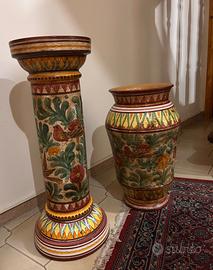 Vendo elegante vaso in ceramica completo di colonna, decorato con motivi floreali e piccoli uccelli. I colori caldi e vivaci (oro, verde, rosso e ocra) e le ricche lavorazioni lo rendono un elemento d’arredo unico e di grande impatto.