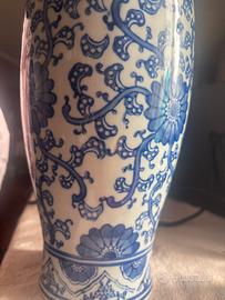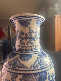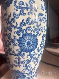Elegante vaso in porcellana decorato con raffinati motivi floreali in blu su sfondo bianco, ispirato allo stile tradizionale orientale. La superficie presenta dettagli intricati con fiori e tralci sinuosi, lavorati con grande precisione.