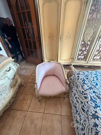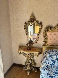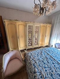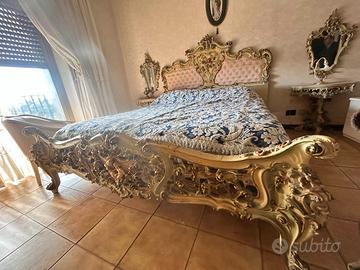 Vendesi lussuosa camera da letto matrimoniale in pieno stile Barocco Veneziano. Un set unico per chi desidera arredare con sfarzo e prestigio. Il set include: 1. Letto matrimoniale con testata e pediera intagliate e dorate. Testata imbottita in capitonné rosa chiaro. 2. Armadio 6 ante monumentale. Le quattro ante laterali presentano decori floreali, mentre le 2 ante centrali sono arricchite di un complesso traforo in legno dorato a motivi floreali e volute barocche. interni spaziosi e rifiniti. 3. Comò bombato a tre cassetti capienti , con specchiera coordinata di grandi dimensioni e ripiano in marmo. 4. Coppia di comodini con ripiano in marmo e due specchi. 5. Coppia di poltrone con struttura intagliata e dorata, seduta e schienale in capitonné rosa chiaro. Prezzo affare, contattare se interessati. Disponibile per visione. Smontaggio e trasporto a carico dell'acquirente.
