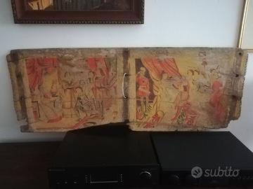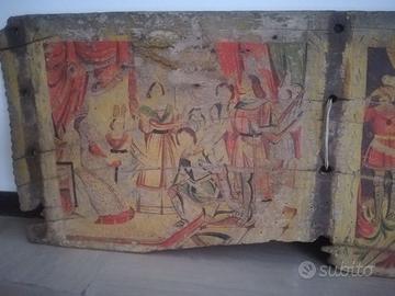 Antica sponda di carretto siciliano con scene di paladini a corte, di eccezionale fattura e cromia