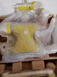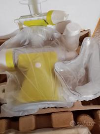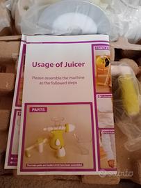 Vendo questo spremiagrumi manuale di colore verde e bianco. È in ottime condizioni ed è perfetto per preparare succhi di frutta freschi.