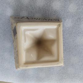 spremiagrumi da collezione vintage pubblicitario " la domenica del corriere" in porcellana e legno a forma romboidale misura cm 13*15*6
