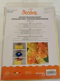 Vendo spugnetta supporto per la realizzazione dei fiori di pasta di zucchero marca Decora. Inoltre a disposizione set di 11 foglie per la realizzazione di foglie realistiche.