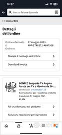 Vendo staffa angolare per Tv comprata su amazon due anni fa, come si vede da foto ordine e prezzo d’acquisto, come nuova, utilizzata solo temporaneamente vendo oggi per inutilizzo. Allego descrizione del prodotto di amazon: BONTEC Supporto TV Angolo Parete per TV o Monitor da 26-50 pollici, Orientabile e Inclinabile Staffa TV Angolo, Max VESA 400x400mm, Fino a 45 kg