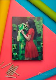 Il design presenta un forte contrasto tra la ragazza con un vestito rosso vibrante e il massiccio sfondo pixelato verde del celebre mob Creeper. Un'interpretazione artistica e moderna del gioco.