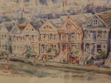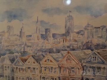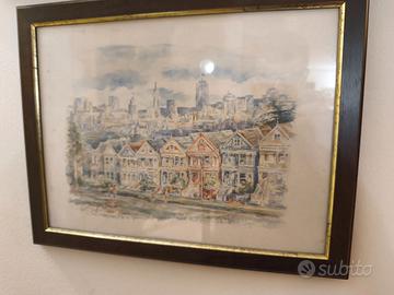 Quadro con cornice rappresentante una veduta acquerellata di San Francisco, caratterizzata dalle celebri case vittoriane, note come "Painted Ladies", in primo piano ad Alamo Square, con lo skyline della città sullo sfondo. Ecco alcuni dettagli sull'opera e sul suo autore: L'Opera Titolo: Comunemente indicata come "San Francisco Victorian Houses". Stile: Acquerello contemporaneo che bilancia dettagli architettonici e un'atmosfera soffusa. Soggetto: Le sette case vittoriane di Steiner Street ad Alamo Square, con una vista che include l'iconica Transamerica Pyramid e altri grattacieli del centro. L'Artista: Jegai Identità: Si tratta di un artista francese noto per diverse vedute di San Francisco realizzate con questa tecnica, tra cui raffigurazioni di Lombard Street, del Golden Gate Bridge e dei famosi Cable Car. Egli è pittore e acquerellista francese che ha ottenuto una discreta popolarità internazionale, in particolare tra la fine degli anni '80 e gli anni '90. l suo stile è un realismo morbido. Utilizza l'acquerello con toni pastello e una tecnica che fonde precisione architettonica e atmosfere quasi sognanti, evitando contrasti troppo netti a favore di una luminosità diffusa.