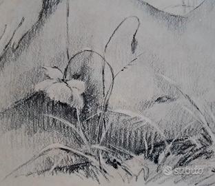 Elegante stampa d’arte in bianco e nero raffigurante una figura femminile sdraiata tra i fiori, con firma in basso a destra C. Parisi.