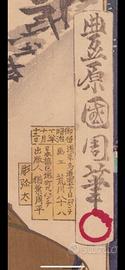 La firma/cartiglio e lo stile pittorico sono di Toyohara Kunichika (豊原国周, 1835–1900), uno dei più importanti autori di stampe kabuki del Meiji.