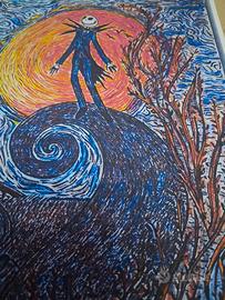 Stampa formato A4 su carta fotografica opaca di una illustrazione originale raffigurante il film di Tim Burton Nightmare Before Christmas. Il protagonista del film Jack tra i due mondi, ossia tra il mondo del Natale e quello di Halloween.