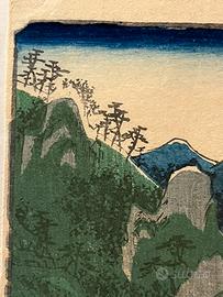In “Sakanoshita” (五十三次阪の下), il vento tra gli alberi, le montagne in lontananza e il delicato equilibrio tra cielo e terra catturano un momento sospeso, quasi poetico. Questa stampa non è solo un’opera d’arte: è un viaggio nel cuore del Giappone antico, un invito a fermarsi, osservare e sognare.