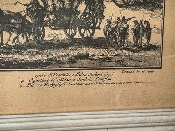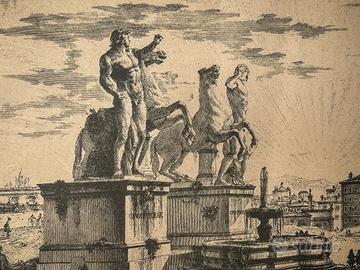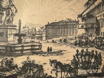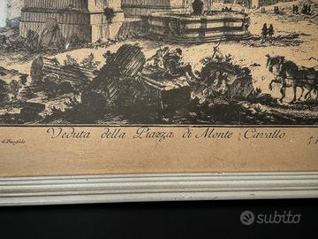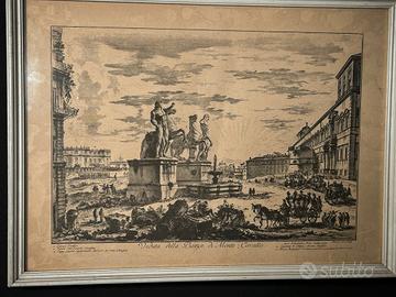 Stampa Piazza di Monte Cavallo Veduta della Piazza di Monte Cavallo Stampa depoca Elegante stampa depoca raffigurante la celebre Veduta della Piazza di Monte Cavallo, tratta dalle incisioni settecentesche ispirate ai lavori di Giovanni Battista Piranesi. La composizione mostra con ricchezza di dettagli il complesso monumentale con le statue colossali, il Palazzo Pontificio e le figure in movimento che animano la scena urbana. Cornice coeva in legno dipinto, in stile classico. Dimensioni Totali: Altezza 37cm - Larghezza 50cm Codice: R7XQ19FZ