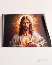 Stampa su tela sintetica di alta qualità, raffigurante Gesù Cristo in una rappresentazione intensa e luminosa. Il volto sereno e lo sguardo diretto trasmettono pace e spiritualità, mentre la croce radiante al centro del petto simboleggia fede e protezione. L’aureola dorata e i raggi di luce sullo sfondo creano un effetto mistico e suggestivo, perfetto per arricchire ambienti domestici o spazi dedicati alla preghiera.