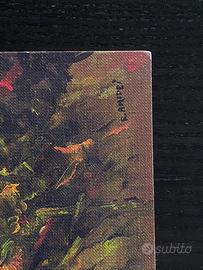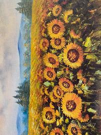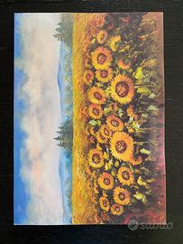 Stampa su cartoncino effetto tela cm. 35x25, raffigurante un paesaggio con campo di girasoli, con monti e conifere sullo sfondo e cielo con nuvole, firmato R. Amedei.