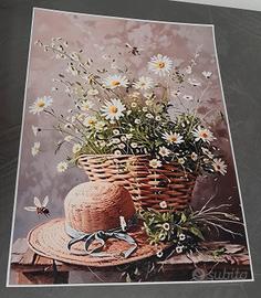 Bellissima stampa su tela che raffigura un cesto di fiori di campo con un cappello di paglia, 30x40